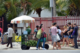 Once docked & the ship was cleared, Cheryl and I disembarked at 9:30 and caught a shuttle bus to the marketplace, about a 20-minute ride. We could tell quickly we were back in South America – graffiti on buildings, trash thrown about. The first few pictures you see here are quite deceptive – in fact, the skyline itself is most impressive until you actually drive into the city. Don’t get me wrong – there were some very nice structures, but all were fortified with 15-20’ iron fences & safeguarded with razor wire. The marketplace was nothing more than a converted jailhouse with several small shops selling lace, wood products, & clothing. The ocean was directly across the street – we noticed a decent hotel and decided to walk over. We had to hike through a vacant field and then cross three motorways. You can see from the pictures below that the residents don’t use trash receptacles. The beaches were fairly nice but we weren't dressed for it - plus - it was already in the mid-80’s with high humidity – we decided to return to the downtown area & marketplaces. The hotel gate guard stopped us and warned us not to turn right once we left the property – he said we would be mugged, even in broad daylight. We could see the abandoned buildings nearby with several gangs lingering. We were directed to take the pedestrian bridge over the roadways that connected the hotel to the marketplace – we didn’t see the bridge when we initially visited the hotel.